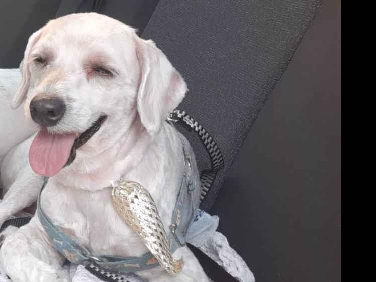 Cachorro médio, 5 anos, Poodle, cor Branca.